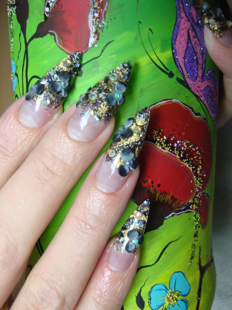 Декоративный френч. Кончик ногтя выполнен с применением цветных пудр и слюды. Прорисовка акриловыми красками.